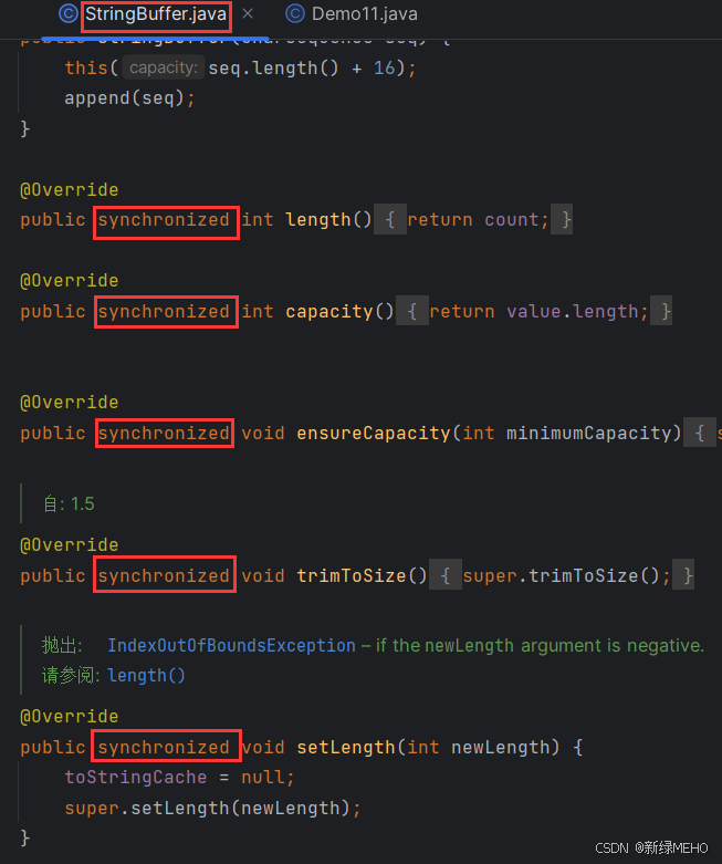 Java 标准库中很多都是线程不安全的 . 这些类可能会涉及到多线程修改共享数据 , 又没有任何加锁措施 . ArrayList LinkedList HashMap TreeMap HashSet TreeSet StringBuilder 但是还有一些是线程安全的 . 使用了一些锁机制来控制 . Vector ( 不推荐使用 ) HashTable ( 不推荐使用 ) ConcurrentHashMap StringBuffer我们可以看到,例如StringBuffer类的成员,有不少是加锁的: