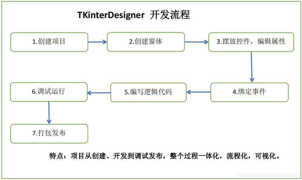Tkinterdesigner是一个基于python的开发工具,用于开发基于tkinter界面的python应用程序项目。但它与其它类型的开发工具的最大不同之处在于,它提供了一套完整的开发流程,目前python并不缺开发IDE,缺的是合理科学的开发流程,缺的是应对大量模块方向的辅助工具。Tkinterdesigner是一套Python进行应用软件开发的解决方案,包括了从项目创建到界面设计,再到事件逻辑编辑与调试运行到打包发布的整体开发流程,以及在这个基础上建立的资源平台和开发者生态。