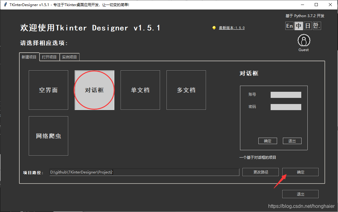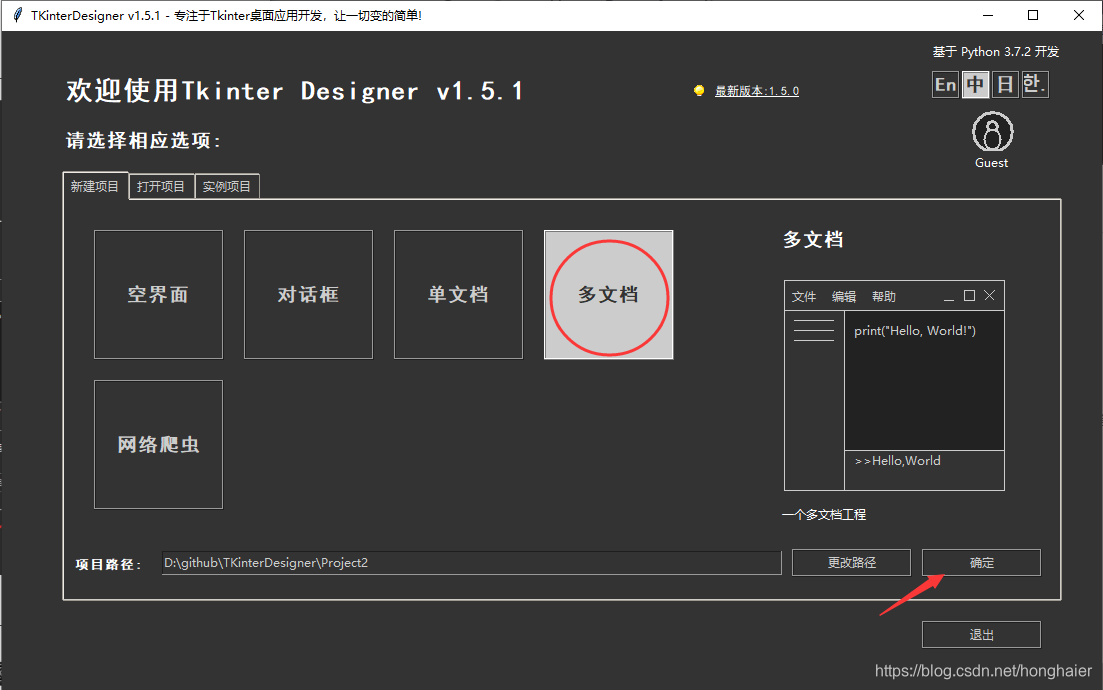 提供了五个模版示例, 包括空白界面项目、对话框项目、单文档项目、多文档项目和网络爬虫。您只需选择相应的项目,点击“确定”即可完成项目的建立。如果需要更改项目路径,可以单击“更改路径”进行修改。