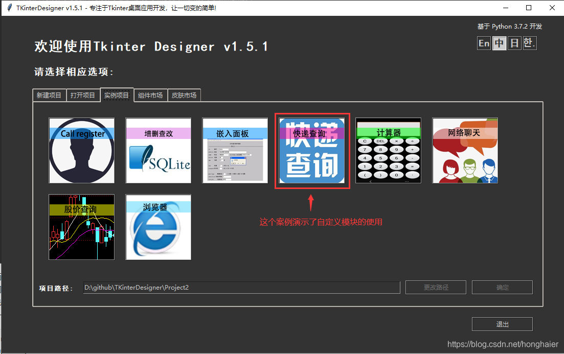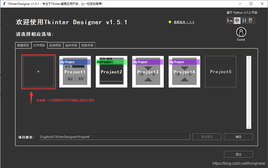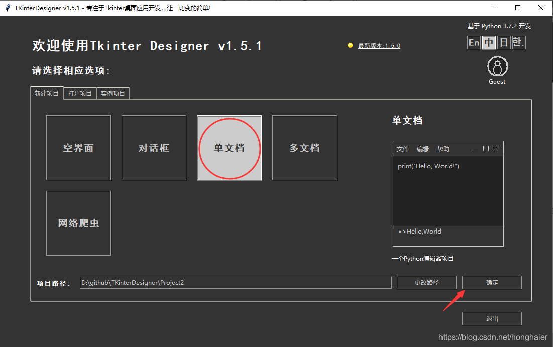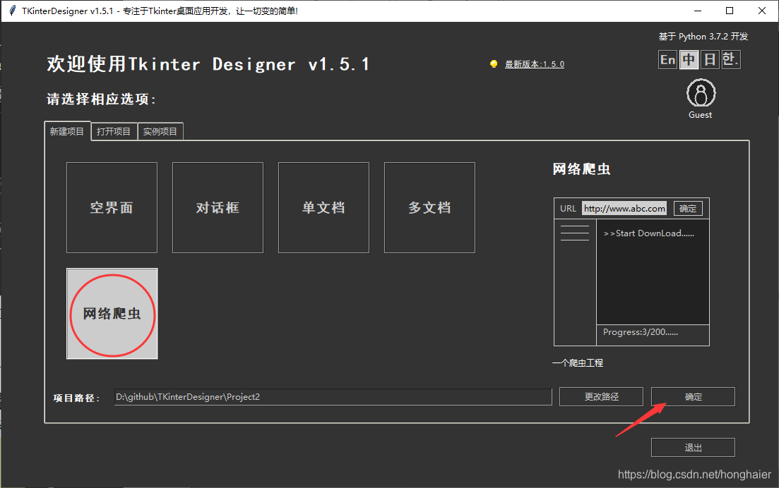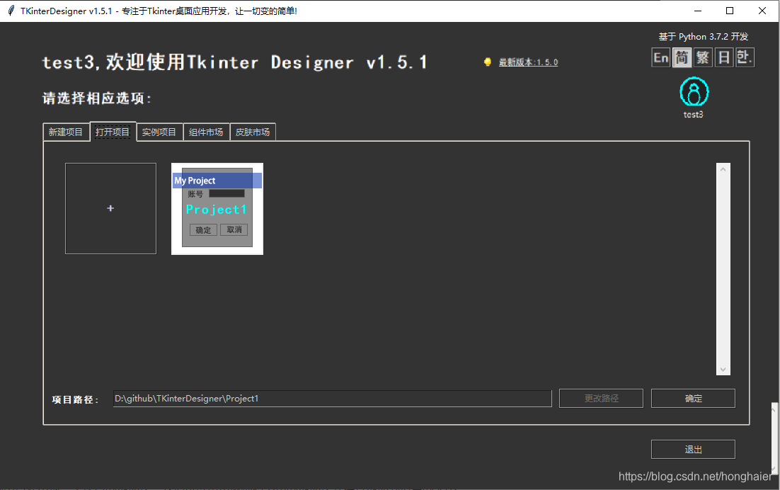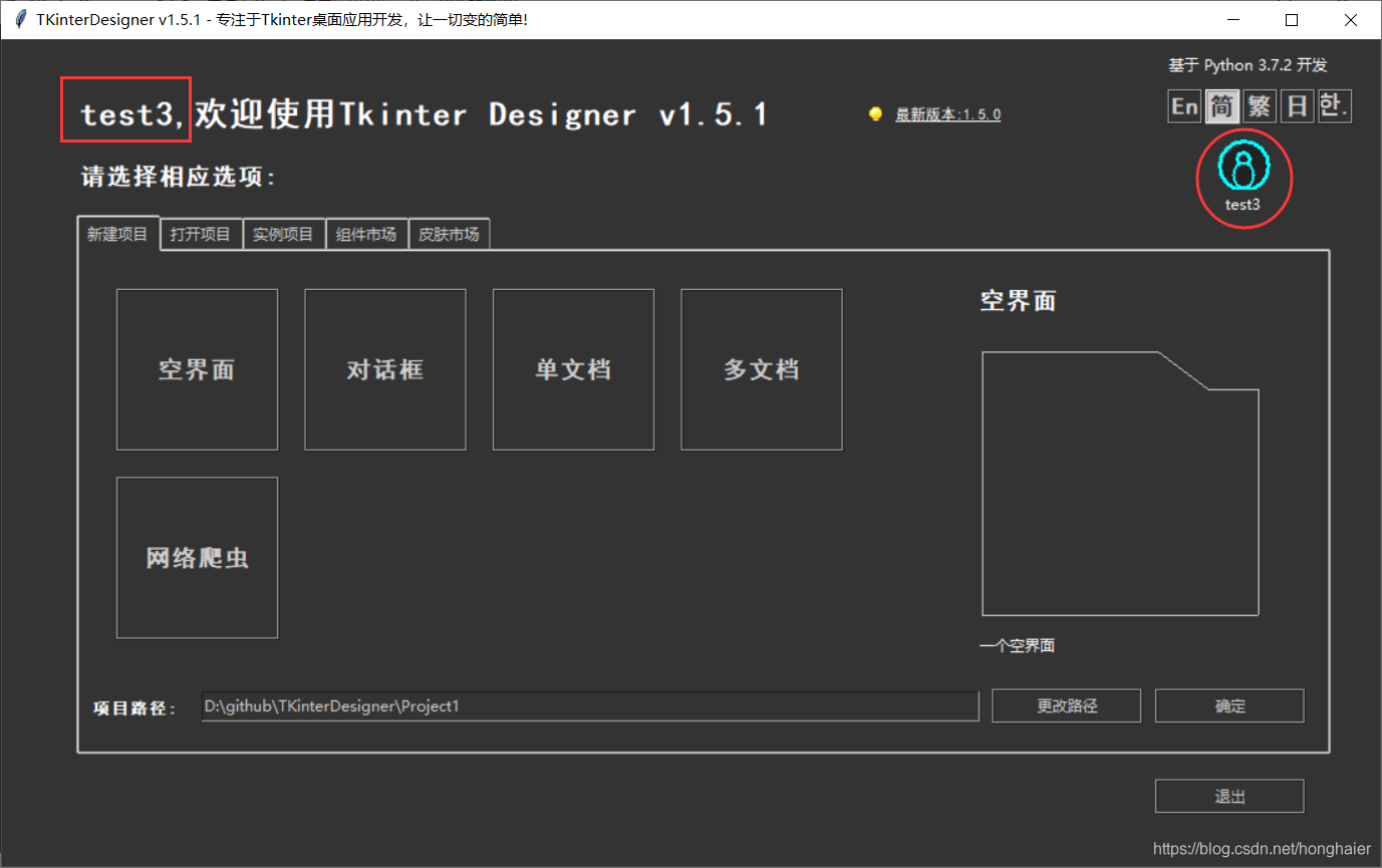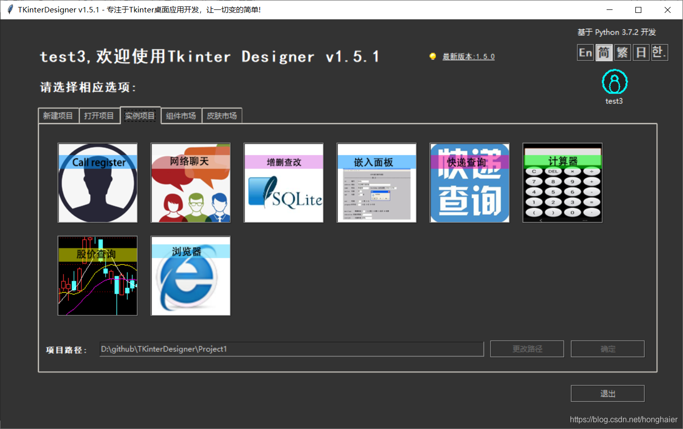 双击TKinterDesigner程序,可以看到一个控制台界面(注意:如果没有安装Python,请安装Python 3.x,如果已经安装而未将Python安装目录加入到系统Path,则弹出设置当前需要对应的Python安装目录用于运行时调用Python命令),在这个页面,您可以根据需要在右上角选择语言,目前提供了五种语言:英语,简体中文,繁体中文,日语,韩语。在这里我们选择简体中文,如果我们当前版本不是最新版本,我们可以看到最新版本提示,点击即可打开最新版本的下载页。