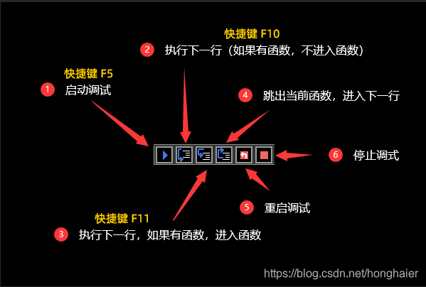 1.F5:继续执行,直至下一断点,在断点或逐行调试时你直接点蓝色箭头也是如此。