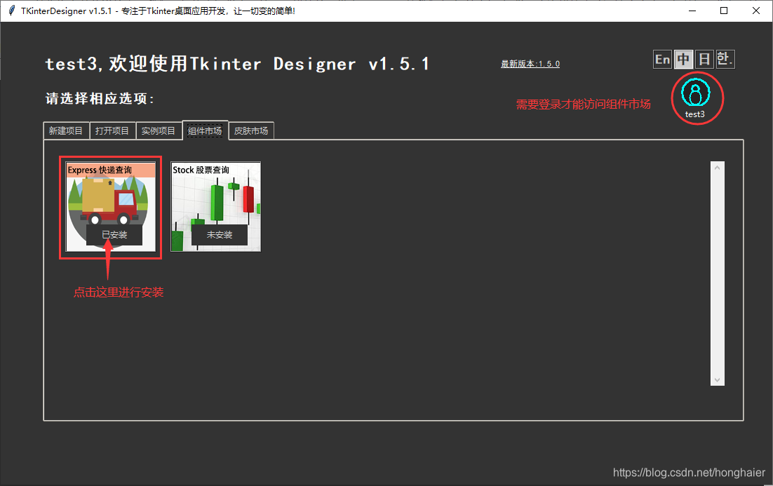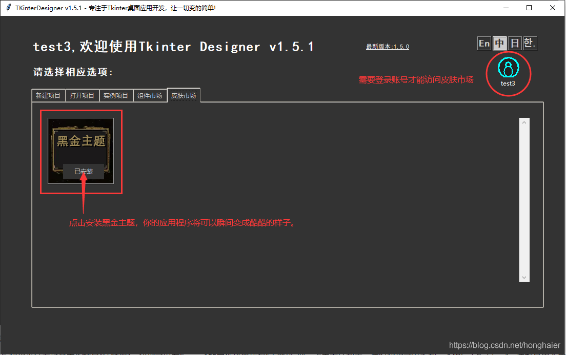 大多数情况下,我们使用TKinter去创建的程序并不够美观,虽然不影响功能开发,但是爱美之心,人皆有之。如果能让程序变的美观一些是最好,不过鉴于我们的开发者用户大多数是程序员,对于美化的部分,能简单化是最好,因此我希望通过提供好的配色方案作为皮肤提供给开发者使用,使程序变的美丽,因此我们也推出了皮肤市场,暂时只有官方皮肤,后面将放开给广大开发者用户上传提交以提供更好的皮肤给大家。但前提是您得是注册账号才可以看到组件市场。