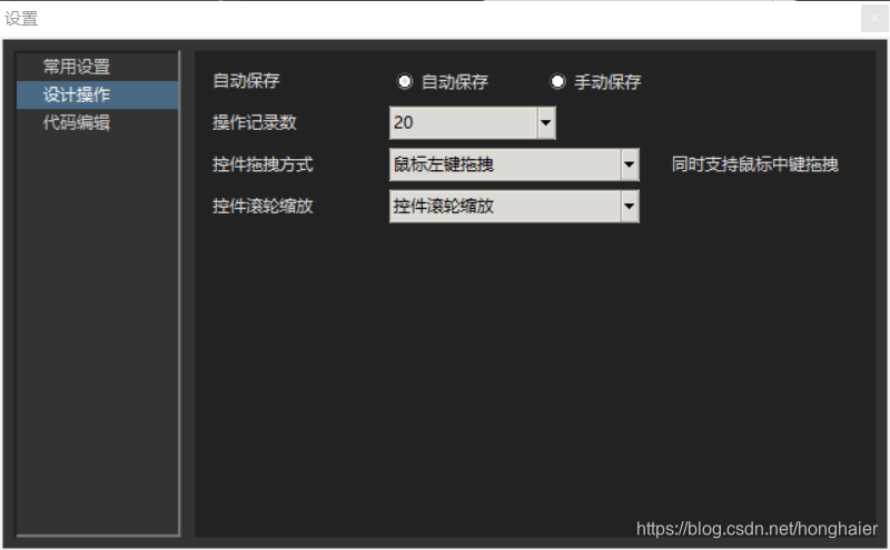控件拖拽方式:一般情况下是直接用鼠标进行拖拽移动,也可以选择CTRL键 + 鼠标左键进行拖拽移动,但始终支持使用鼠标中键拖拽移动。