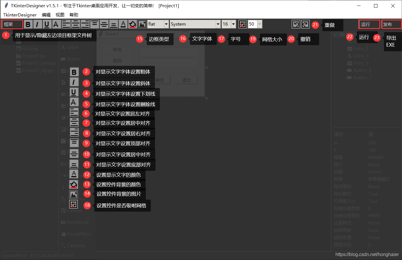 (2) 主菜单下的快捷按钮:框架按钮可以显示或隐藏框架结构树,运行按钮可以快速运行项目进行测试,发布按钮可以将项目打包发布为EXE程序。另外,还有一些常见的对齐设置,文字字体,前景背景颜色,图片背景快捷按钮。