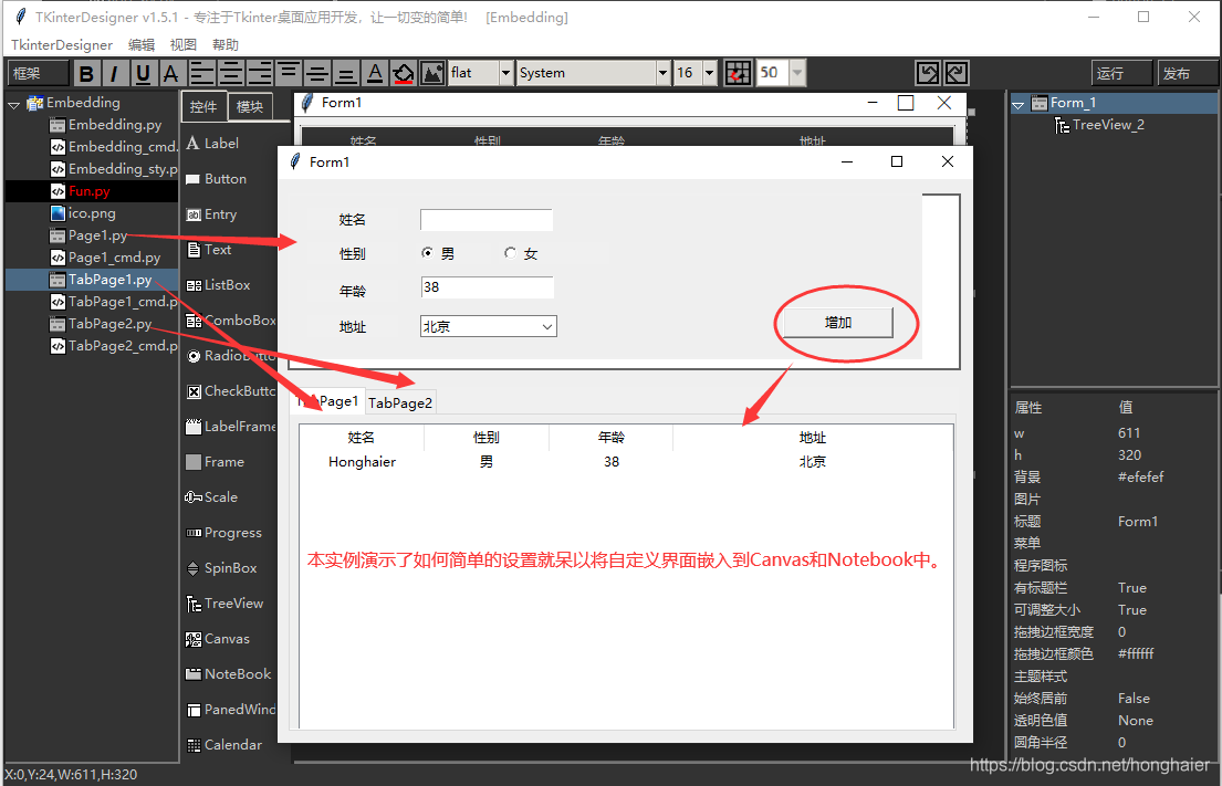 在这个项目里,我们实现了分割窗体与页面嵌入,你可以利用这个功能来做一些独立的界面并通过嵌入的方式来把它们组合到一个界面中,TKinterDesigner目前支持Frame,NoteBook和PanedWindow三种嵌入模式。其中Frame是用来嵌入一个页面,NoteBook用来为每个页嵌入对应的页面,PanedWindow用来为分割的两个部分嵌入对应的页面,操作时只需要按照对应属性去设置就可以了。