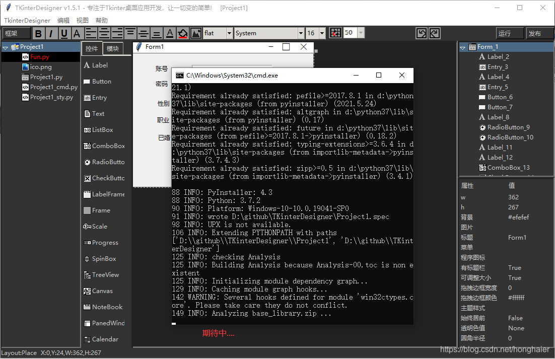 单击“确定”按钮,tkinterdesigner将开始调用打包程序来打包项目。