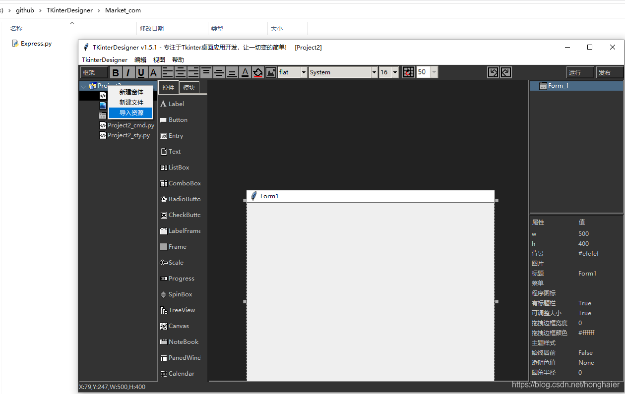 现在我们创建一个空白项目,然后我们在左边Project2树项上用鼠标右键单击,在弹出菜单里选择”导入资源“,将Market_com中的Express.py导入进来。