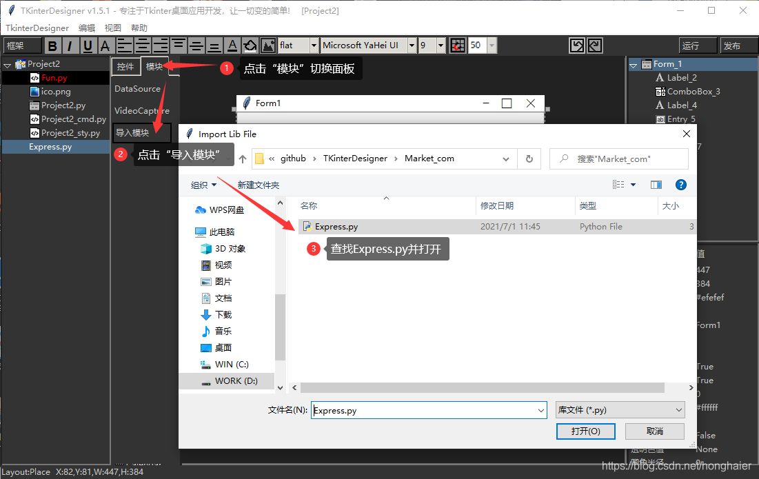 现在我们已经完成了界面的设计,我们将切换到工具栏的“模块”页面。在“模块”页面中,我们单击“import module”按钮,然后找到“Express”。点击“打开”。实际上,“Express.py”不必在当前目录中。您可以将一个模块用于多个项目,只需在此处导入,而不需要为用于同一模块的每个项目创建模块类文件。