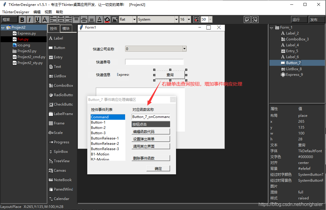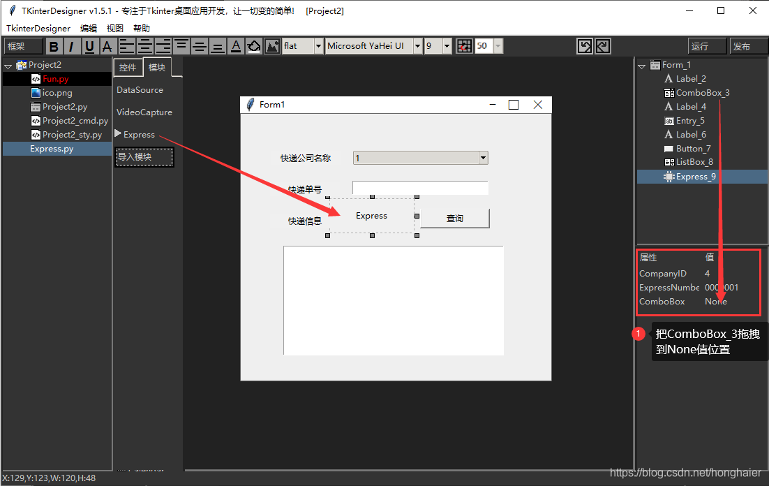 我们可以看到,在右下角的属性框中,express模块的三个变量显示在属性框中。我们可以手动设置“CompanyID”和“ExpressNumber”,但是如何设置ComboBox呢?在这里,您只需要在右上角的控件树中找到相应的ComboBox,然后拖动到属性框中“combobox”的值项位置。然后我们将命令响应函数添加到“query”按钮。