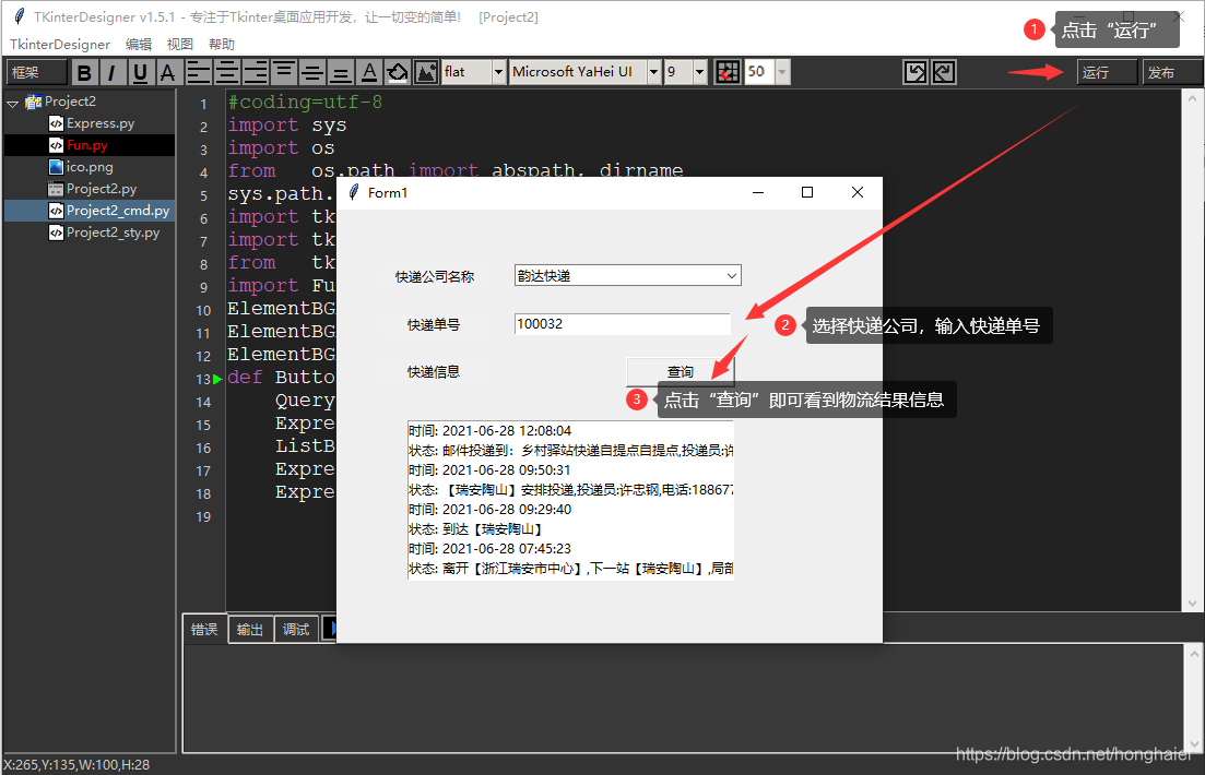 设置快递号,最后调用查询方法进行查询。参数是显示的ListBox对象。 完成后,点击右上角”Run"运行它。我们可以看到正在运行的程序。尝试在快递订单号中输入号码后,点击“查询”,很快就会看到列表框中显示的快递信息。