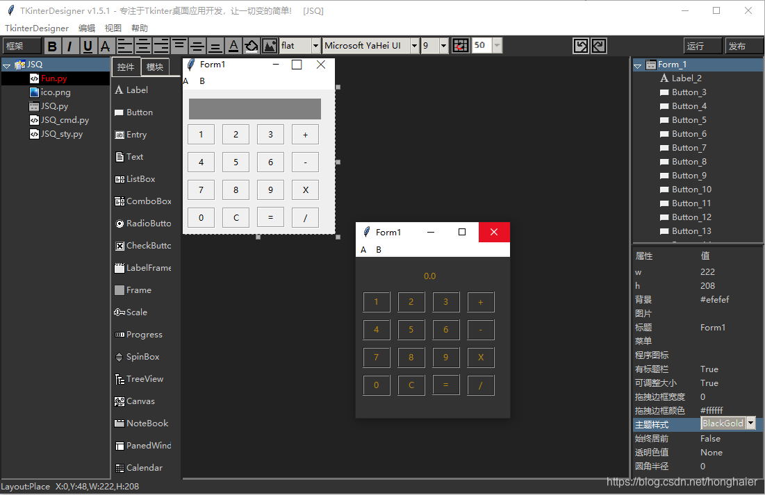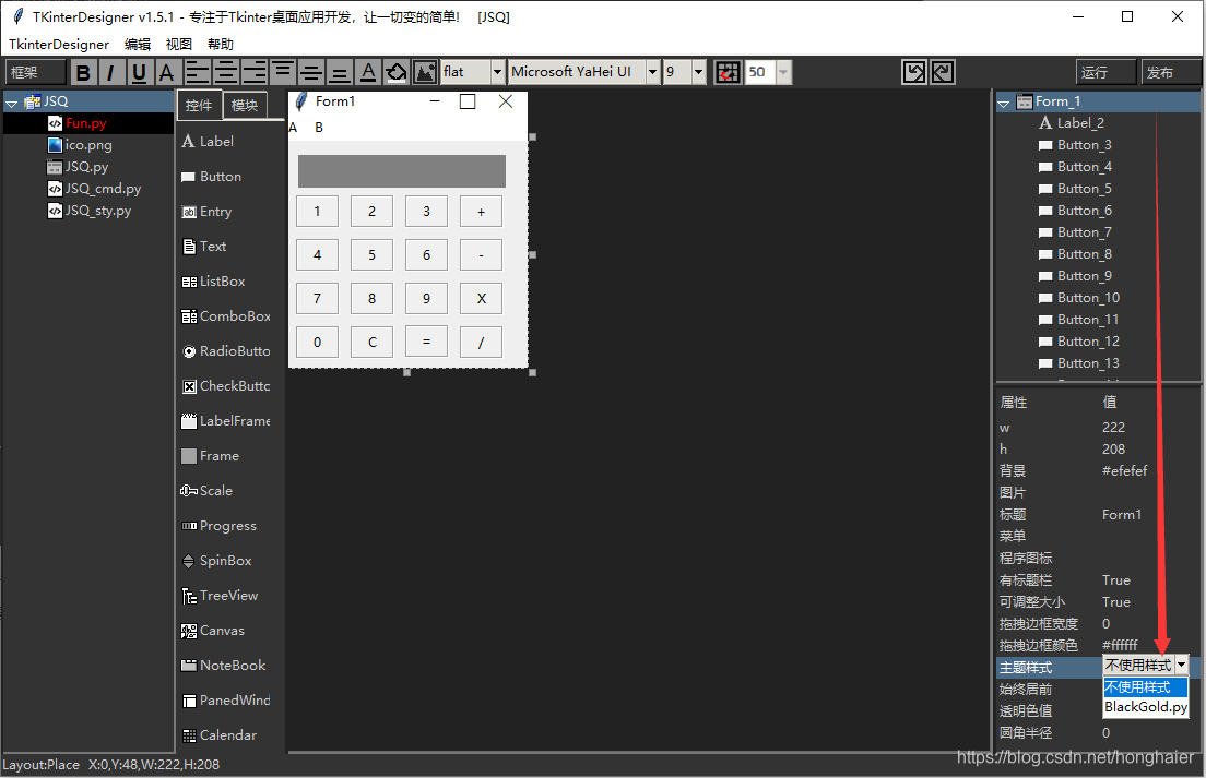 然后我们尝试着打开实例项目"计算器",我们可以在Form_1的属性栏里找到"主题样式",点击下拉列表,这时我们可以看到一个”BlackGold.py",这就是黑金皮肤了。