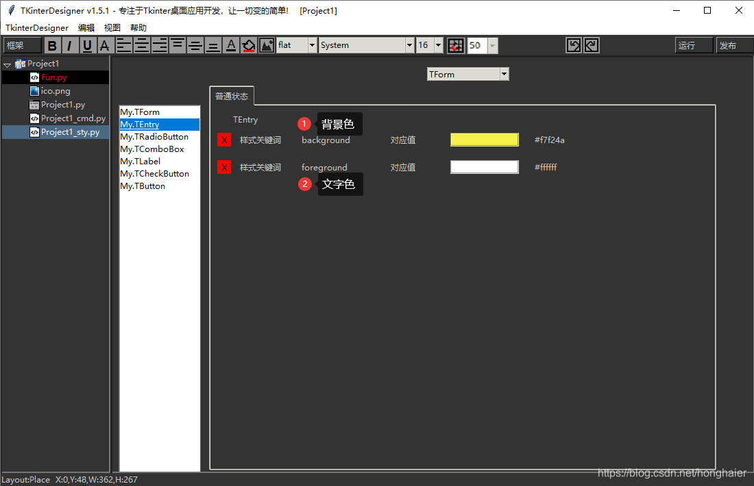 在这个界面里,我们在样式名称里输入My,并在对应控件列表里选择”TEntry“,点击”新增样式“按钮,并为两个关键值"background"和"foreground"设置颜色。