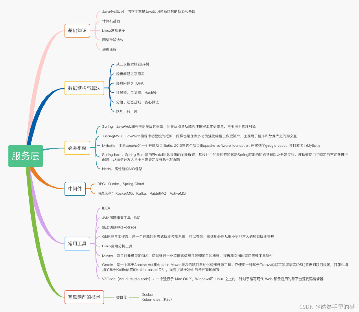 这一层有点东西了,算是整个框架的核心,如果你跟敖丙一样以后都是从事后端开发的话,我们基本上整个技术生涯,大部分时间都在跟这一层的技术栈打交道了,各种琳琅满目的中间件,计算机基础知识,Linux操作,算法数据结构,架构框架,研发工具等等。