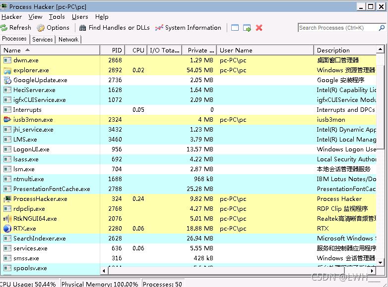 功能:ProcessHacker是一款不错的进程分析工具,可查看所有进程信息,包括进程加载的dll、进程打开的文件、进程读写的注册表……,也可以将特定进程的内存空间Dump到本地,此外还可以查看网络连接。