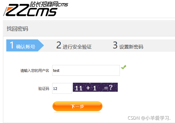 3.跳转到“找回密码”页面,按照提示输入我们想要重置账户名(test)