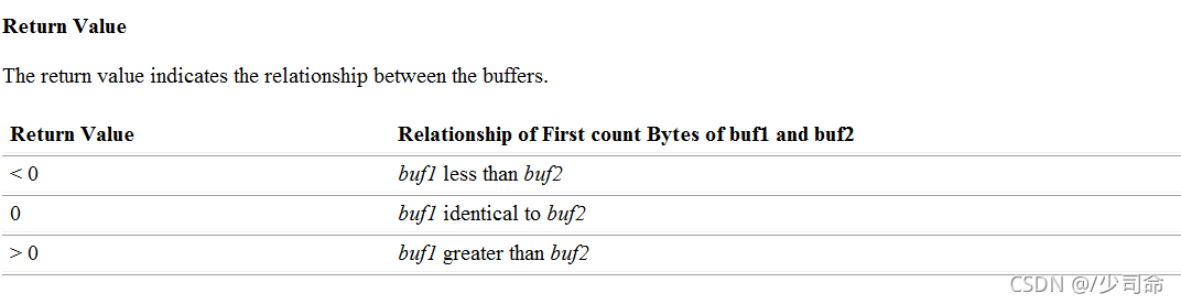 字符串大小的比较是以ASCII 码表上的顺序来决定,次顺序亦为字符的值。memcmp()首先将s1 第一个字符值减去s2 第一个字符的值,若差为0 则再继续比较下个字符,若差值不为0 则将差值返回。例如,字符串"Ab"和"ba"比较则会返回字符'A'(65)和'b'(98)的差值(-33)。