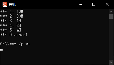 下不了直接复制粘贴到文本文件,后缀名txt改成bat,解释一下数字冒号后面是剩余关机时间,0是取消关机(如果已经设置关机了再次启动程序输入0然后回车就能取消定时关机),不明白的你敲个0到5试一下就知道什么意思了
