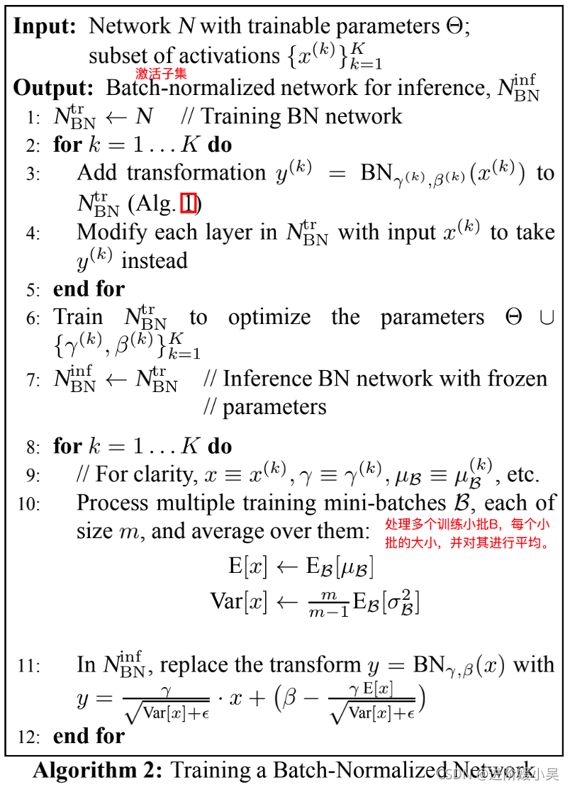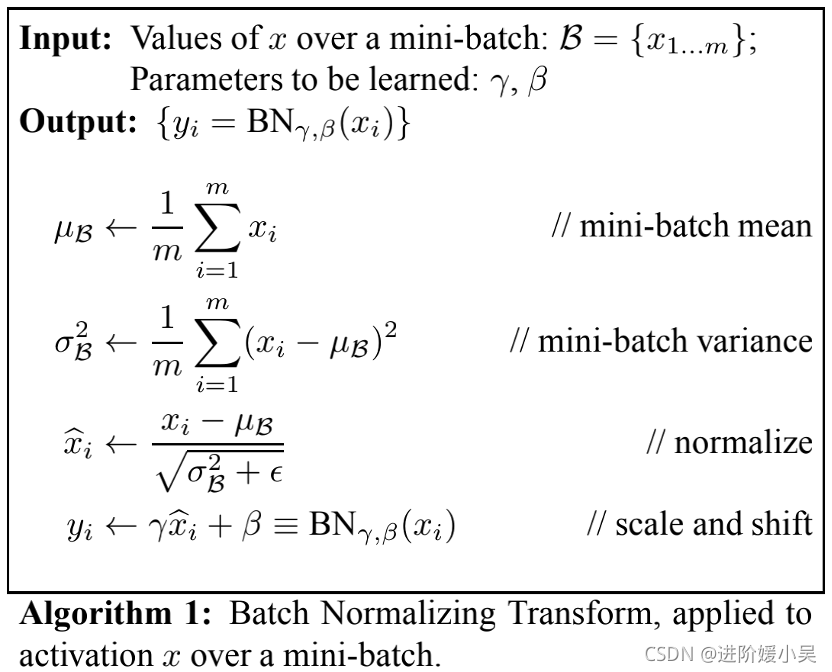 在算法1中详细说明了BN。在该算法中,ϵ是一个为了数值稳定性而加到mini-batch variance上的常数。
