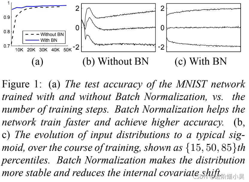 (b,c)在训练过程中,输入分布向典型的sigmoid演变,显示为{15,50,85}的百分位数。批量归一化使分布更加稳定,并减少了内部协变量的转移。