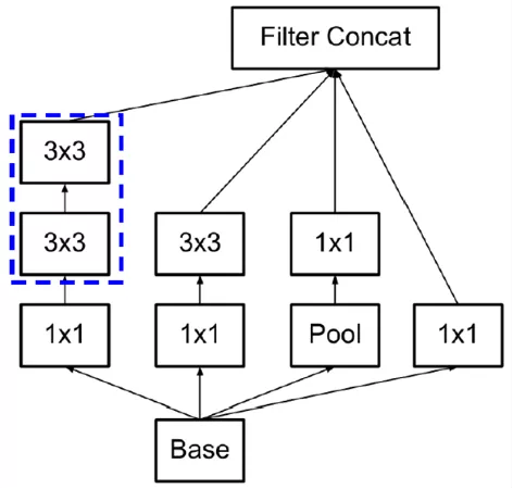 - 5×5卷积核→2个3×3卷积核。相同的感受野。