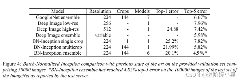 在提供的包含50000个图像的验证集上,与以前的最新技术进行批量标准化初始比较。*根据测试服务器的报告,在ImageNet测试集的100000张图像上,BN初始集成已达到4.82% top-5。