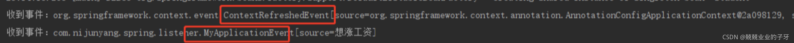 执行代码会发现我们的监听器会监听到两个事件,因为我们监听器监听的事件是ApplicationEvent,上面说到容器启动的时候,最后会执行finishRefresh方法发布ContextRefreshedEvent事件,容器启动完成之后,我们自己手动发布了一个我们自己的事件,因此会监听到两个事件。