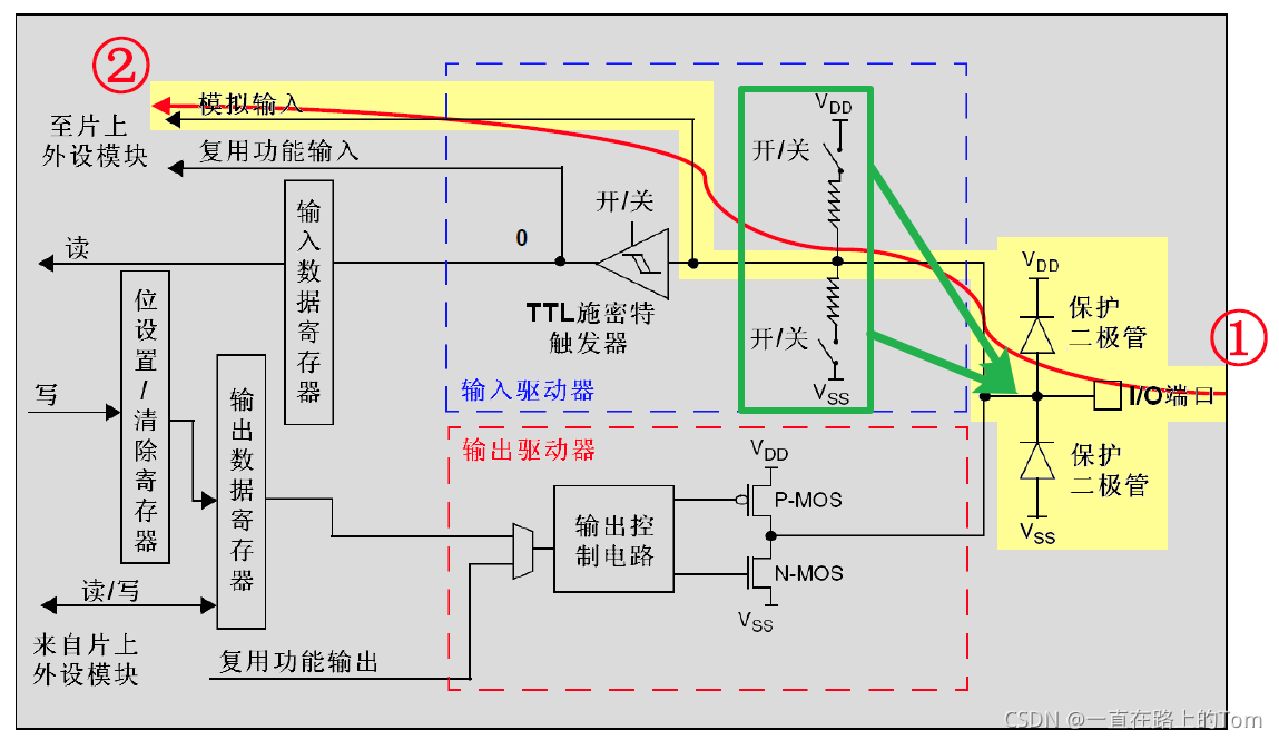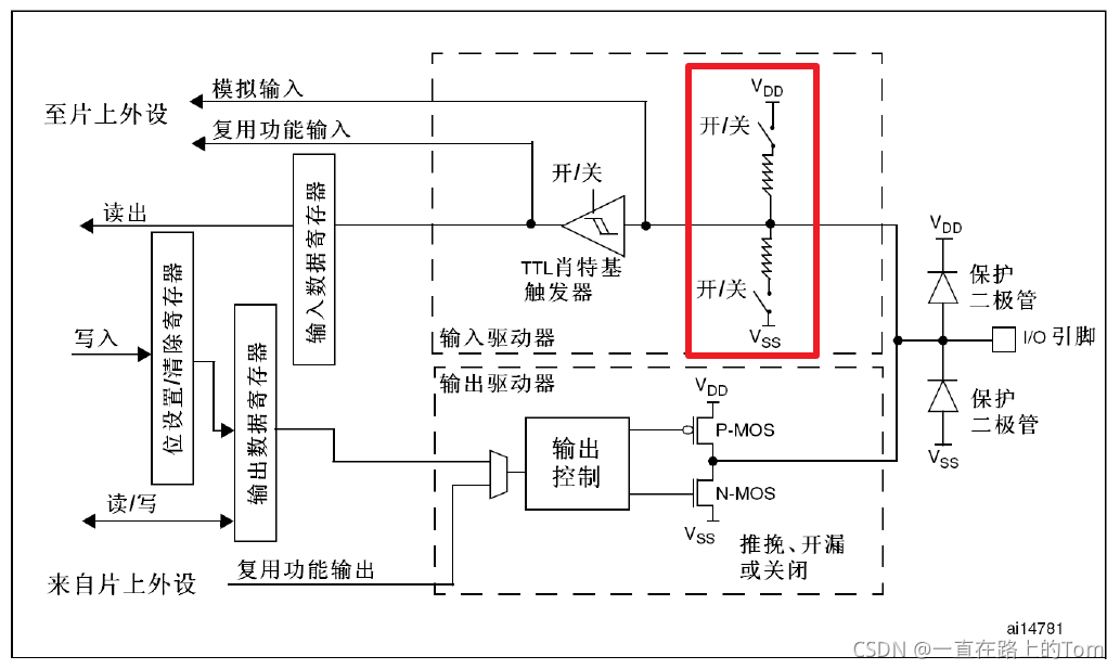 模拟输入输出模式中,双MOS管结构被关闭,施密特触发器停用,上/下拉也被禁止,其他外设通过模拟通道进行输入输出。