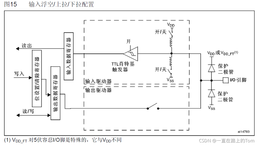 ● 根据输入配置(上拉,下拉或浮动)的不同,弱上拉和下拉电阻被连接