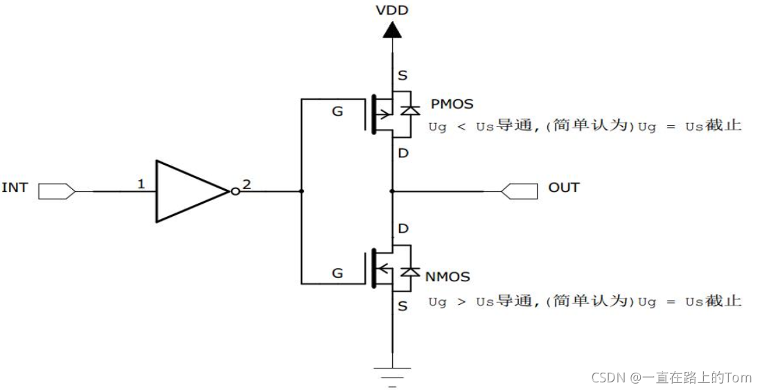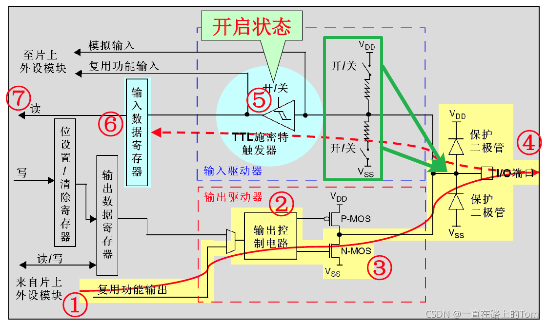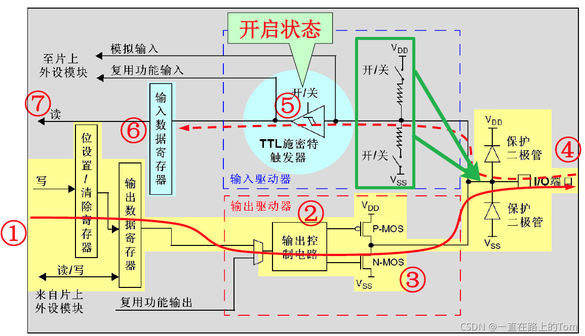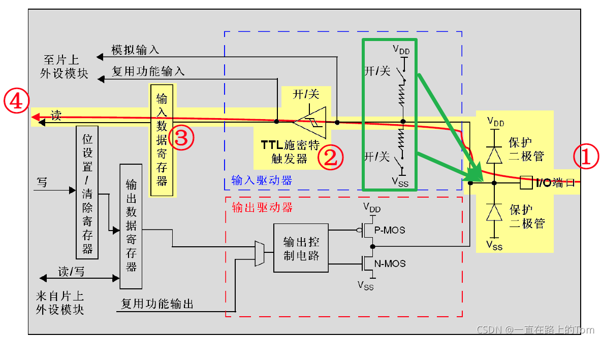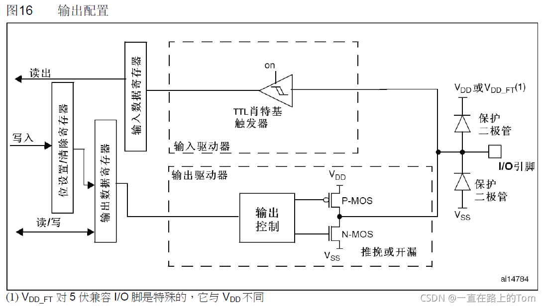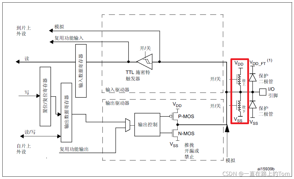 GPIO引脚线路经过两个保护二极管后,向上流向“输入模式”结构,向下流向“输出模式”结构。先看输出模式部分,线路经过一个由P-MOS和N-MOS管组成的单元电路,这个结构使GPIO具有了“推挽输出”和“开漏输出”两种模式。