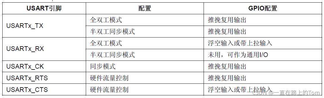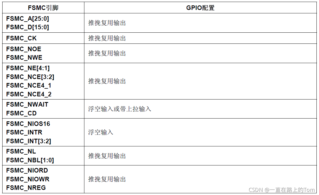 复用功能模式中,输出使能,输出速度可配置,可工作在开漏及推挽模式,但是输出信号源于其它外设,输出数据寄存器GPIOx_ODR无效;输入可用,通过输入数据寄存器可获取I/O实际状态,但一般直接用外设的寄存器来获取该数据信号。