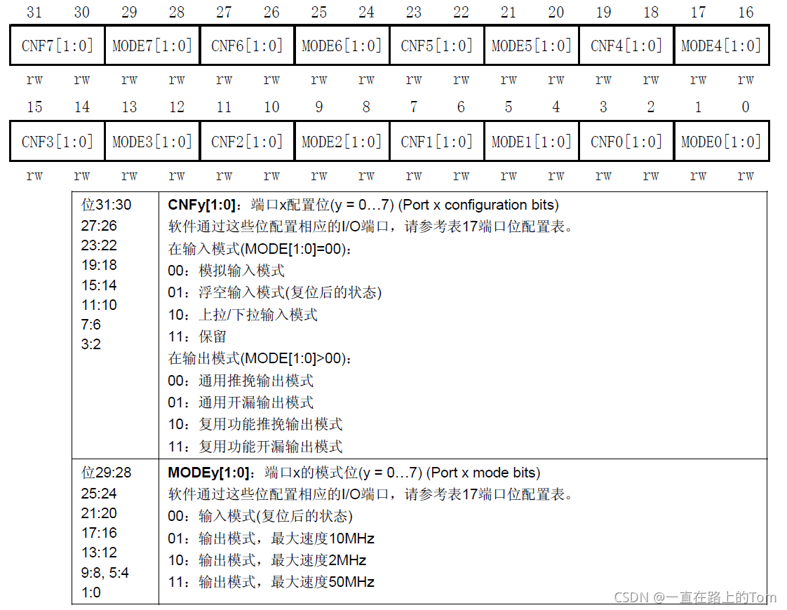 在输出模式中,输出使能,推挽模式时以双MOS管的方式工作,输出数据寄存器GPIOx_ODR可控制I/O输出高低点评。开漏模式时,只有N-MOS工作,输出数据寄存器可控制I/O输出高阻态或低电平。输出速度可配置,有2MHz\25MHz\50MHz的选项。此处的输出速度即I/O支持的高低电平状态最高切换频率,支持的频率越高,功耗越大,如果功耗要求不严格,把速度设置成最大即可。