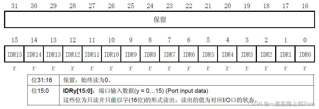 此时施密特触发器时打开的,即输入可用,通过输入数据寄存器GPIOx_IDR可读取I/O的实际状态。