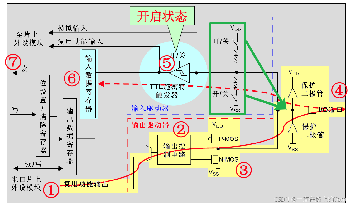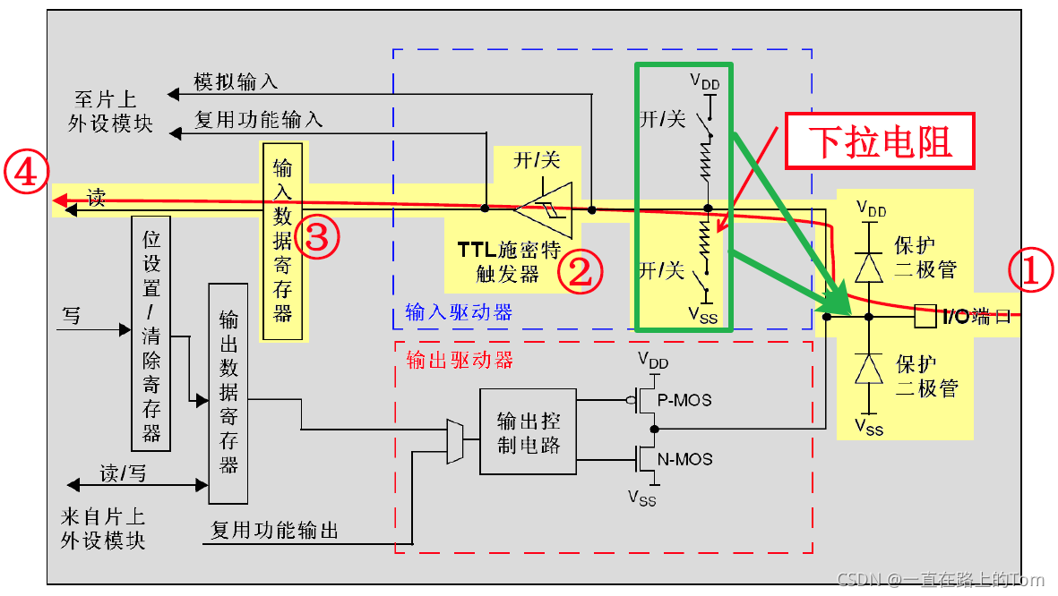CPU先写入输出数据寄存器中,再经过输出控制电路,最终到达端口(在此模式下,IO口也可以读取IO口电压)。在开漏输出模式时,只有N-MOS管工作,如果我们控制输出为0,低电平,则P-MOS管关闭,N-MOS管导通,使输出低电平,I/O端口的电平就是低电平,若控制输出为1时,高电平,则P-MOS管和N-MOS管都关闭,输出指令就不会起到作用,此时I/O端口的电平就不会由输出的高电平决定,而是由I/O端口外部的上拉或者下拉决定 如果没有上拉或者下拉 IO口就处于悬空状态,并且此时施密特触发器是打开的,即输入可用,通过输入数据寄存器GPIOx_IDR可读取I/O的实际状态。,I/O口的电平不一定是输出的电平。
