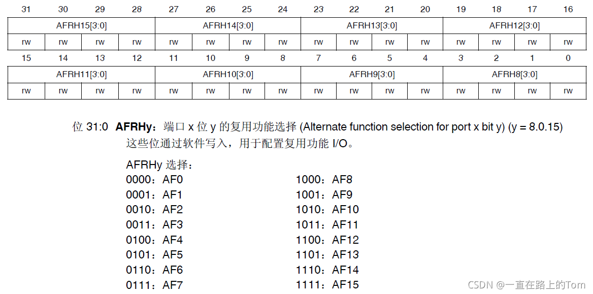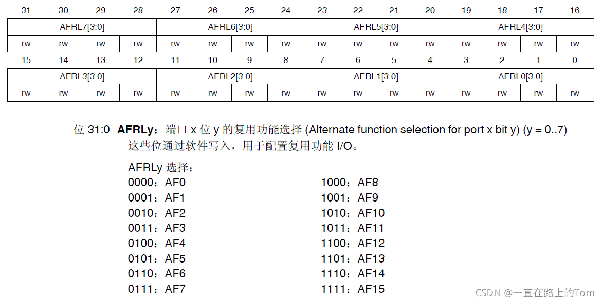 看看这些寄存器的定义,我们就明白,这些寄存器是用于“事件控制”、“重映射”、“调试IO配置”、“外部中断”的。例如 AFIO_EXTICRX 用于选择 EXTIx 外部中断的输入源。