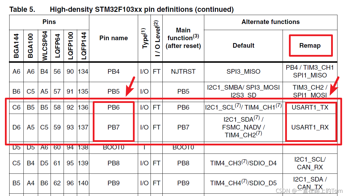 上图中的,Remap对应的I/O就是可以重映射到的I/O,Default就是该I/O默认可复用的功能。从上图中可以看出 串口1 可以重映射到 PB6和PB7引脚,也就是说如果PA9和PA10引脚不好用的时候,或者已经被占用了;那么可以用PB6和PB7来实现串口1的功能。