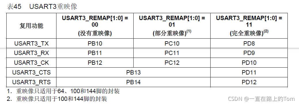 部分重映射:功能外设的部分引脚重新映射,还有一部分引脚是原来的默认引脚。