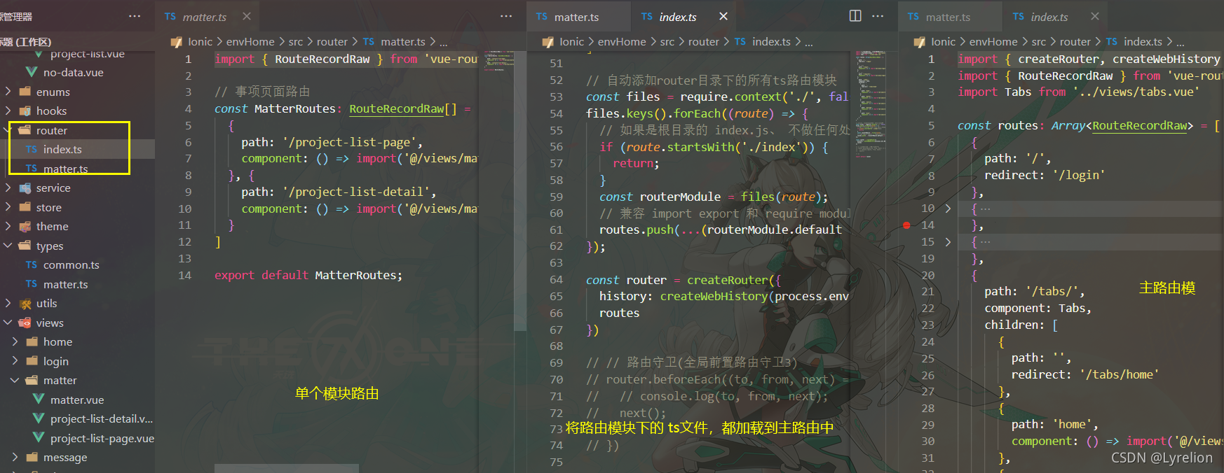 路由根据 tab 可以分成多个模块,写在不同的 .ts 中,主路由模块中会加方法,将 router 文件夹下的所有路由 .ts 文件,添加到主路由模块中- 如果带了 子路由,展示地址: localhost:8080/tabs/home