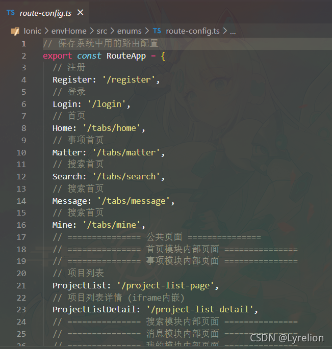 一个技巧:将路由路径存储到单独的 .ts 文件里,需要路由跳转时,通过变量代替直接写地址,这样可以避免后期修改路径名,需要全局挨个修改的麻烦// 路由变量 import { RouteApp } from '@/enums/route-config'; router.push({ path: RouteApp.ProjectList, query: { ... }, });