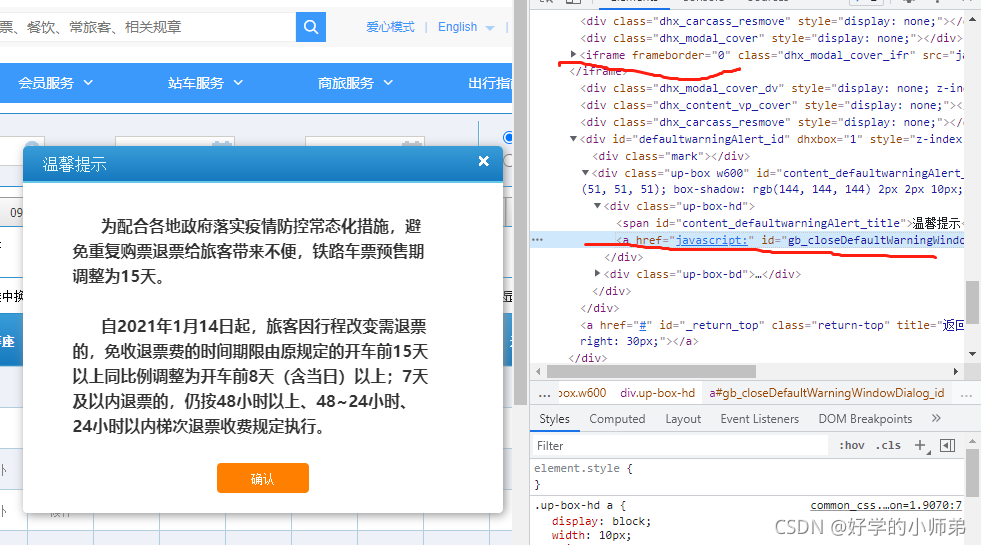 大家好,我是好学的小师弟,今天工作中发现selenium一直定位不了一个弹出框——'温馨提示'。xpath和css都用了,还是定位不了。一开始以为是iframe的锅,后来试了,还是不行。最后发现,是因为我跳转了窗口,虽然xpath的位置是当前窗口页面的元素的位置,但是driver控制的浏览器还停留在前一个窗口页面,这浏览器和页面元素都不匹配,怎么能对的上(笑哭)。。。拿昨天的过期车票能上得了今天的车嘛?明显不能!