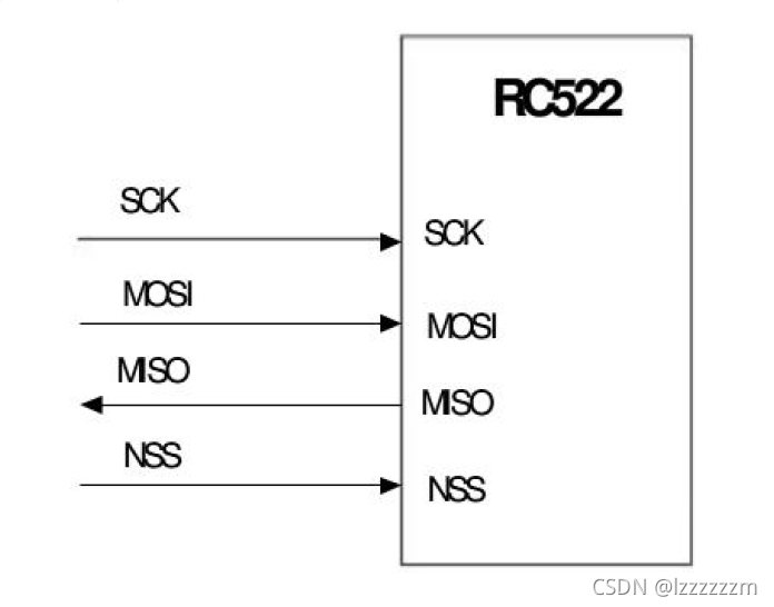 SPI通信中RC522模块作为从机,SPI时钟SCK由单片机产生,MOSI为单片机发送给RC522信息的引脚,MISO为模块发送给单片机信息的引脚。NSS为片选信号。