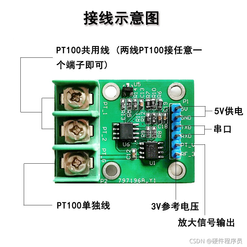 模块可接入两线或三线制接口的PT100传感器,其中三线制接法的优点是将PT100的两侧相等的的导线长度分别加在两侧的电桥臂上,使得导线电阻得以消除,使得测量误差减小。