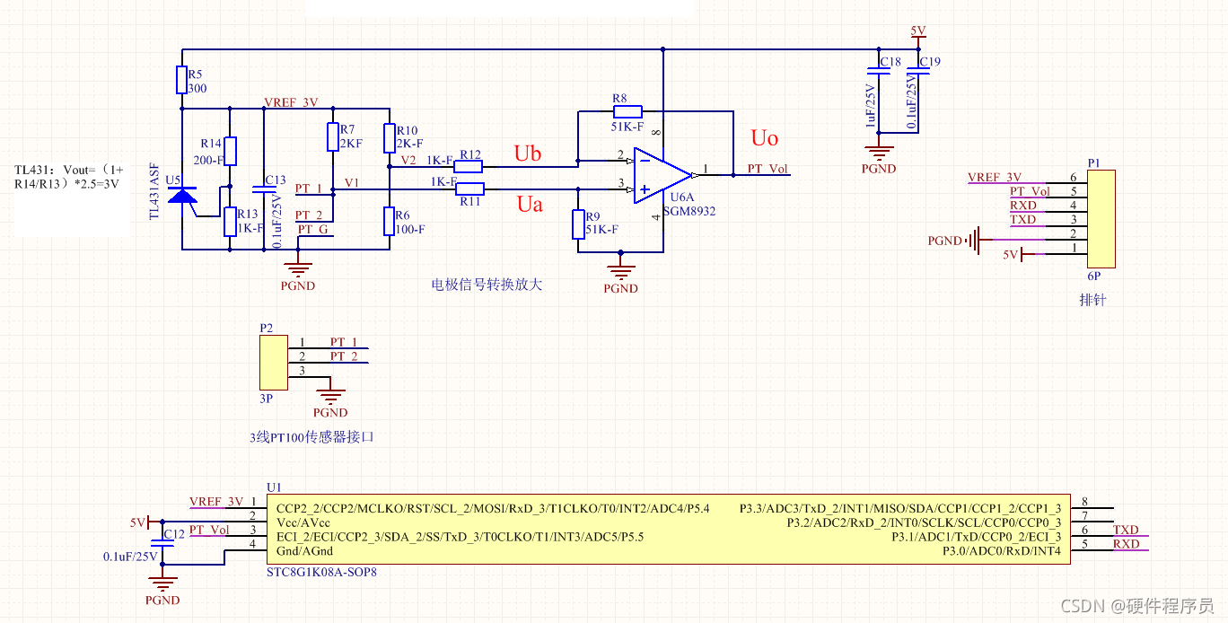 电路采用TL431和R14、R13产生3V的参考电源;采用R6、R7、R10、Pt100构成测量电桥(其中R7=R10),当Pt100的电阻值和R6的电阻值不相等时,电桥输出一个mV级的压差信号,这个压差信号经过运放SGM8932放大后输出期望大小的电压信号,该信号可直接连AD转换芯片。差动放大电路中R11=R12、 R8=R9、放大倍数=R8/R12,运放采用单5V供电。