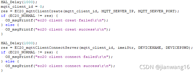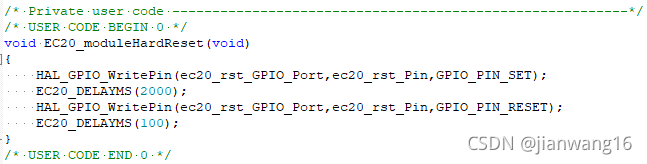 在头文件指定相应的串口操作函数和毫秒级基本延时即可。此外,需要外部实现EC20模组的复位操作,一般是对rst管脚拉高一段时间,复位函数需要指定函数为void EC20_moduleHardReset(void)。