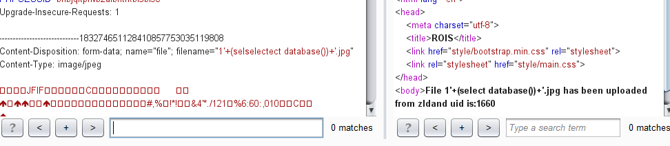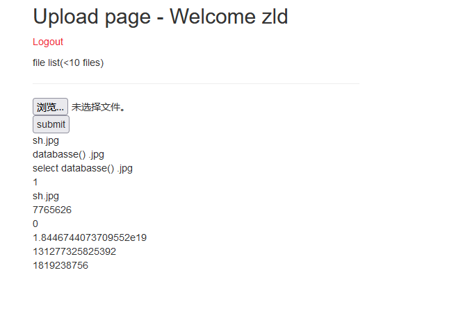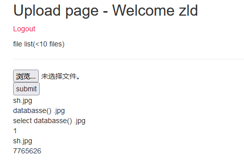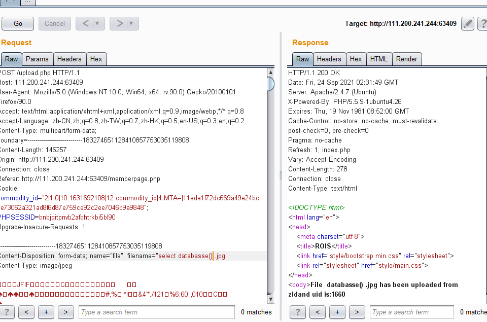 有文件名回显,这说明文件已经被传到了数据库中,游览器又从数据库中读取了上传的文件,那么这个过程久有可能触发sql注入,那么将文件名中加入sql语句,尝试burp抓包修改
