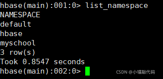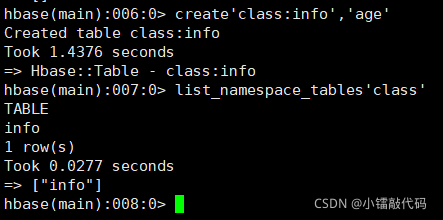 5、创建表(将表创建在指定的命名空间里),并查看是否创表成功
