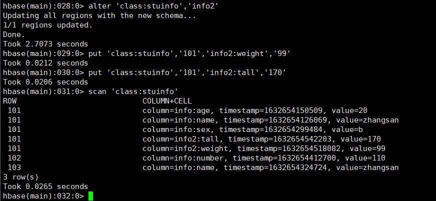 put 'class:stuinfo','101','info2:weight','99'put 'class:stuinfo','102','info2:tall','170'