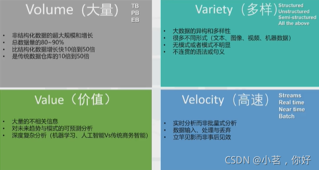 麦肯锡全球研究所给出的定义:—种规模大到在获取、存储、管理、分析方面大大超出了传统数据库软件工具能力范围的数据集合,具有海量的数据规模、快速的数据流转、多样的数据类型和价值密度低四大特征.