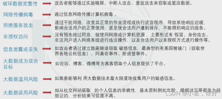 - 评估大数据安全风险。组织除开展信息系统安全风险评估外,还应从大数据环境潜在的系统的脆弱点、恶意利用、后果等不利因素,以及应对措施等评估大数据安全风险。