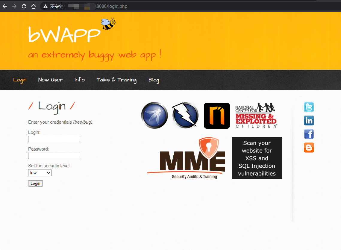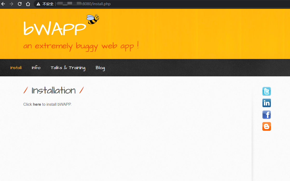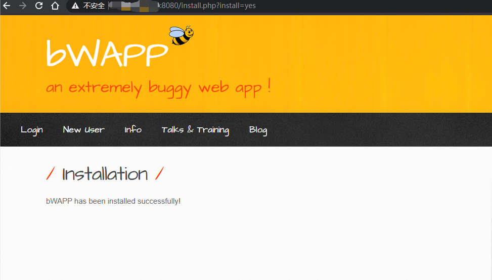 启动成功后访问http://x.xx.xxx.xxx:8080/install.php安装bWAPP数据库