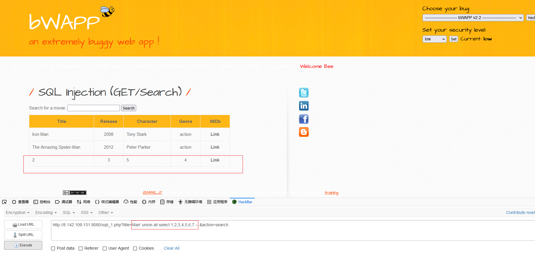 这里需要使用hackbar进行辅助测试,我们将输入改成Man' union all select 1,2,3,4,5,6 --,此时页面会反显数据库的报错信息,且报错说union之后的列数不对,说明拼接的union语句被执行了只是列数不对,只要一步步增加列数就能找到正确的查询列数